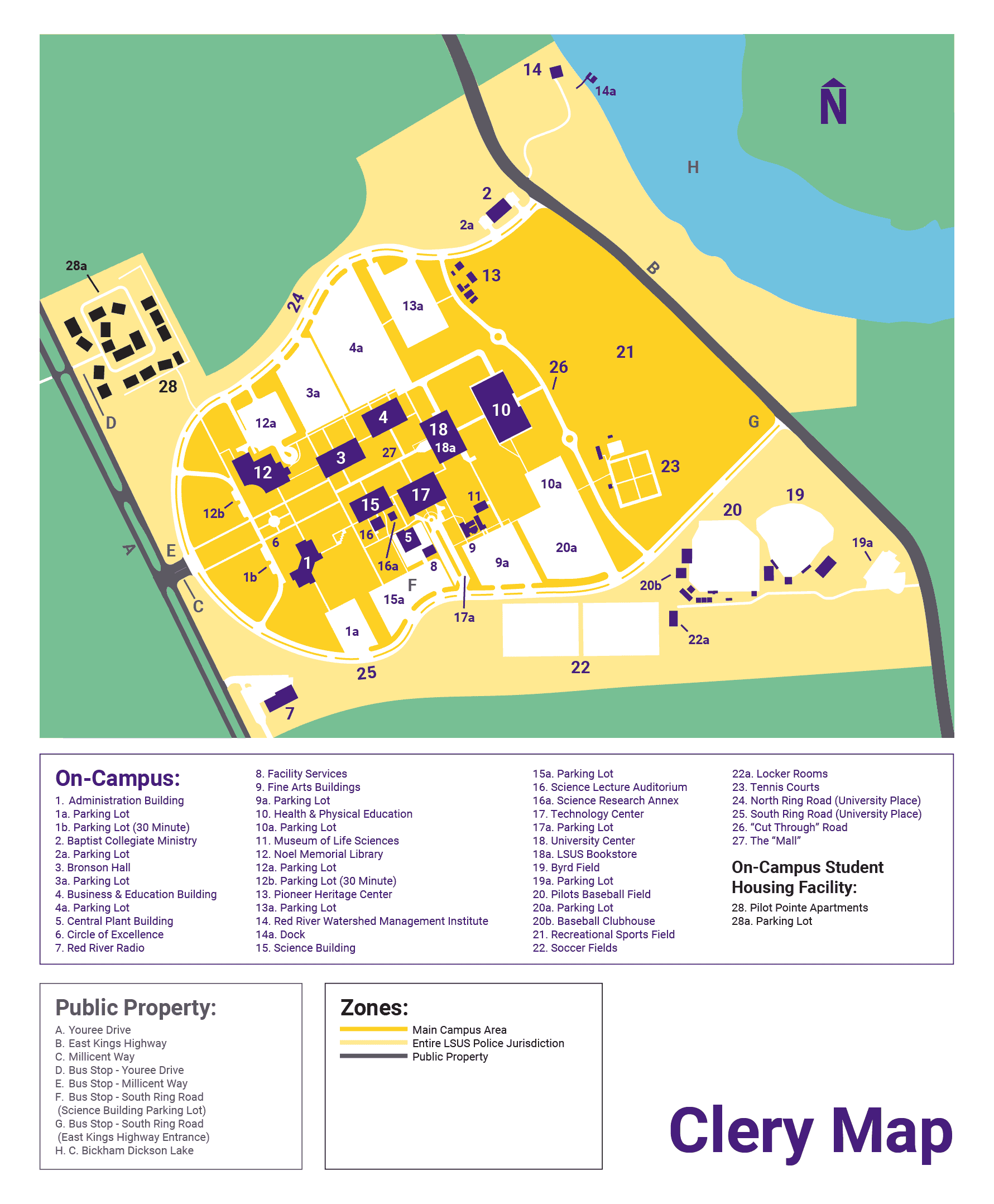 - Public Property: These properties are public or city-owned property immediately adjacent to or run through (touch) LSUS owned or controlled property – only the areas highlighted or labeled in Grey are categorized as Clery defined public property